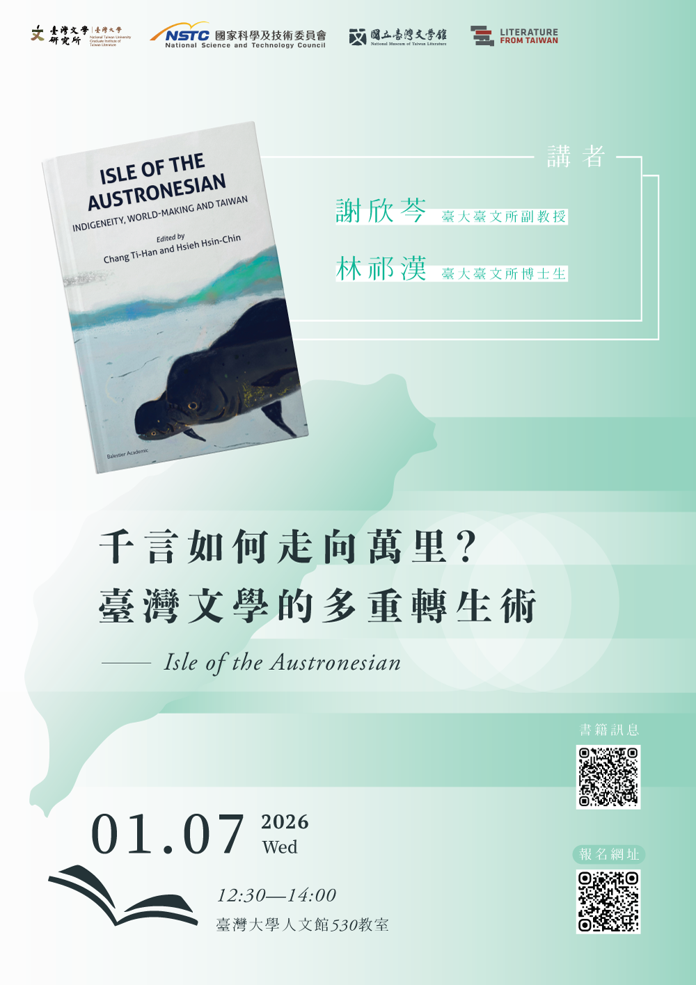 • 【演講公告】2026.01.07臺灣大學臺灣文學研究所謝欣芩副教授、林祁漢博士生演講,歡迎老師、同學踴躍報名參加!