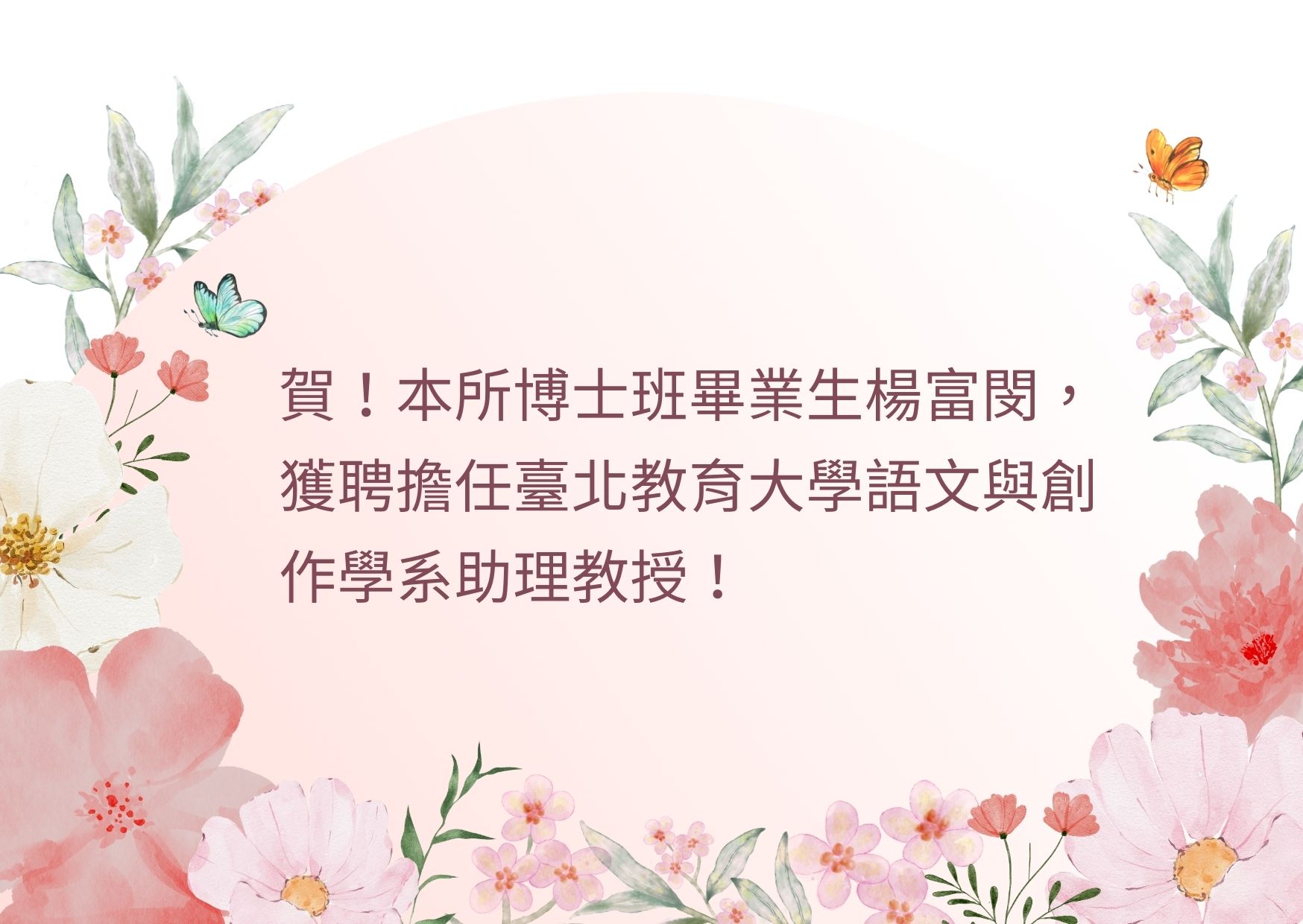 賀!本所博士班畢業生楊富閔,獲聘擔任臺北教育大學語文與創作學系助理教授!